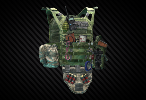 A cheap airsoft bootleg of the Crye Precision JPC plate carrier. Doesn't offer the comfort of the original JPC, but retains extensive customization options. Someone attached an IOTV shoulder pad to this one to act as a groin protector.
